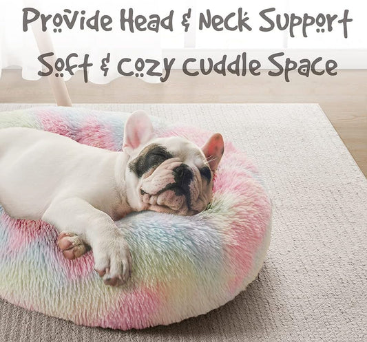 Donut Dog Bed Faux Fur Fluffy Calming Sofa for Large Dogs, Soft & Plush anti Anxiety Pet Couch for Dogs, Machine Washable Coco Pet Bed with Non-Slip Bottom, 36"X36"X8" Rainbow